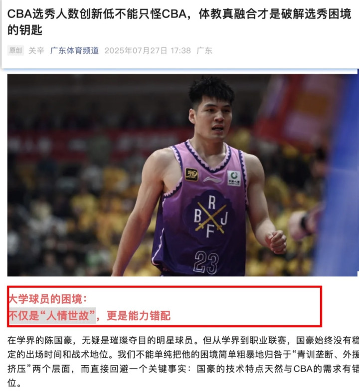近年来,CBA选秀大会的关注度逐年提升,但其为联赛输送即战力的效率始终是外界热议的焦点,大学生球员进入职业联赛后的发展困境,更是让“选秀无用论”的声音不时出现。日前,广东宏远资深跟队记者关辛在社交媒体上就此话题发表了一系列看法,其分析的深度和提出的建议迅速引发了广泛讨论。他并未将问题简单归结于所谓的圈内“人情世故”或资源壁垒,而是以状元秀陈国豪的职业生涯开端作为切入点。陈国豪在大学联赛中是无可争议的明星球员,然而登陆CBA之后,他却迟迟未能获得稳定的出场时间与明确的战术地位。这种从校园明星到职业角色球员的巨大落差,清晰地揭示了CBA选秀机制与大学篮球生态之间存在的深层次结构性矛盾,问题的根源远比想象中复杂。(信息源@广东体育 关辛)
